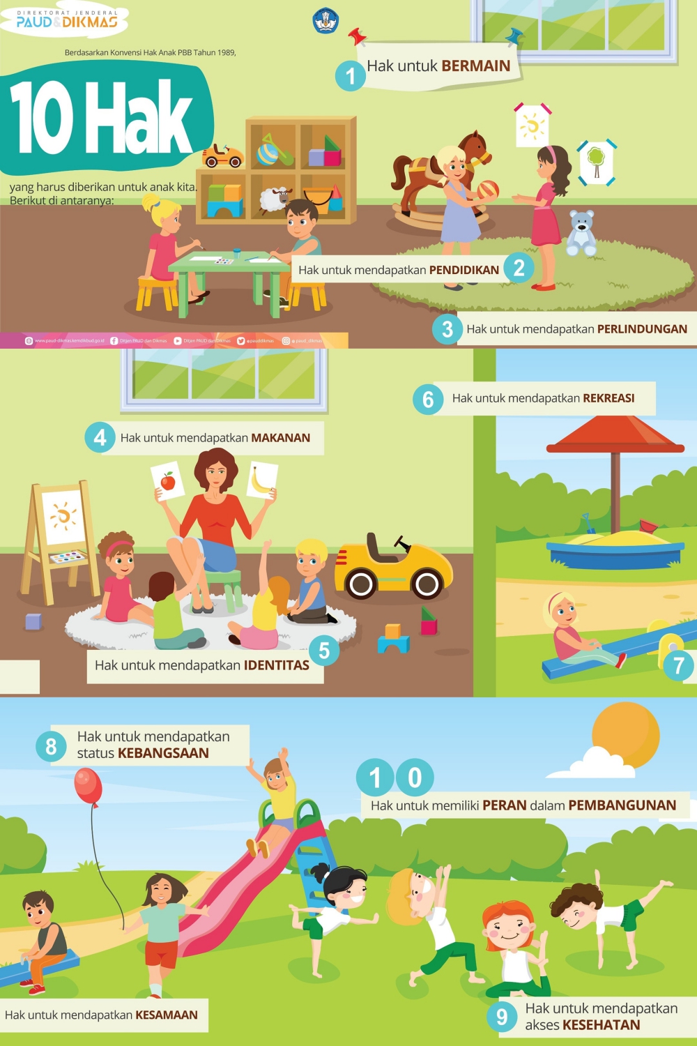 Hak anak diumumkan oleh Perserikatan Bangsa-Bangsa pada tahun 1954, dan baru pada tahun 1989 disahkan sebagai Konvensi Hak-hak Anak. Pemerintah Indonesia sendiri, melalui Keputusan Presiden No.36/1990 tanggal 28 Agustus 1990, pun mengakui hak-hak anak tersebut. Nah berikut ini adalah hak-hak anak menurut Konvensi Hak Anak PBB: 1. Hak untuk BERMAIN 2. Hak untuk mendapatkan PENDIDIKAN 3. Hak untuk mendapatkan PERLINDUNGAN 4. Hak untuk mendapatkan NAMA (identitas) 5. Hak untuk mendapatkan status KEBANGSAAN 6. Hak untuk mendapatkan MAKANAN 7. Hak untuk mendapatkan akses KESEHATAN 8. Hak untuk mendapatkan REKREASI 9. Hak untuk mendapatkan KESAMAAN 10. Hak untuk memiliki PERAN dalam PEMBANGUNAN